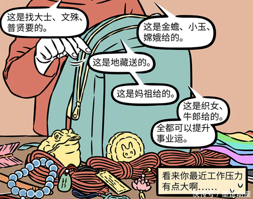 《非人哉》第1092话更新,这一话的内容是关于月老背后里面有什么?虽然背包不大,但里面东西真的很多。有红绳、婚牍还有丘比特的弓箭。甚至还有关羽、文昌帝君、妈祖等等神仙送的护身符。